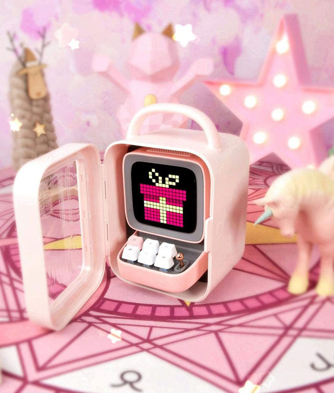 Divoom Ditoo to słodko wyglądający głośnik bluetooth przypominający lata 90-te. Mini komputerek posiada mechaniczną klawiaturę, która może służyć do nawigacji i ustawień, ale również grania. Oczywiście pełnie możliwości daje aplikacja dzięki, której możemy w pełni wykorzystać funkcjonalność głośnika. Wiele radości sprawia zabawa w DJ oraz możliwość tworzenia remiksów. Oprócz komunikacji Bluetooth 5.0, głośnik oferuje również Tuner FM oraz slot kart microSD do odtwarzania nagranych utworów.