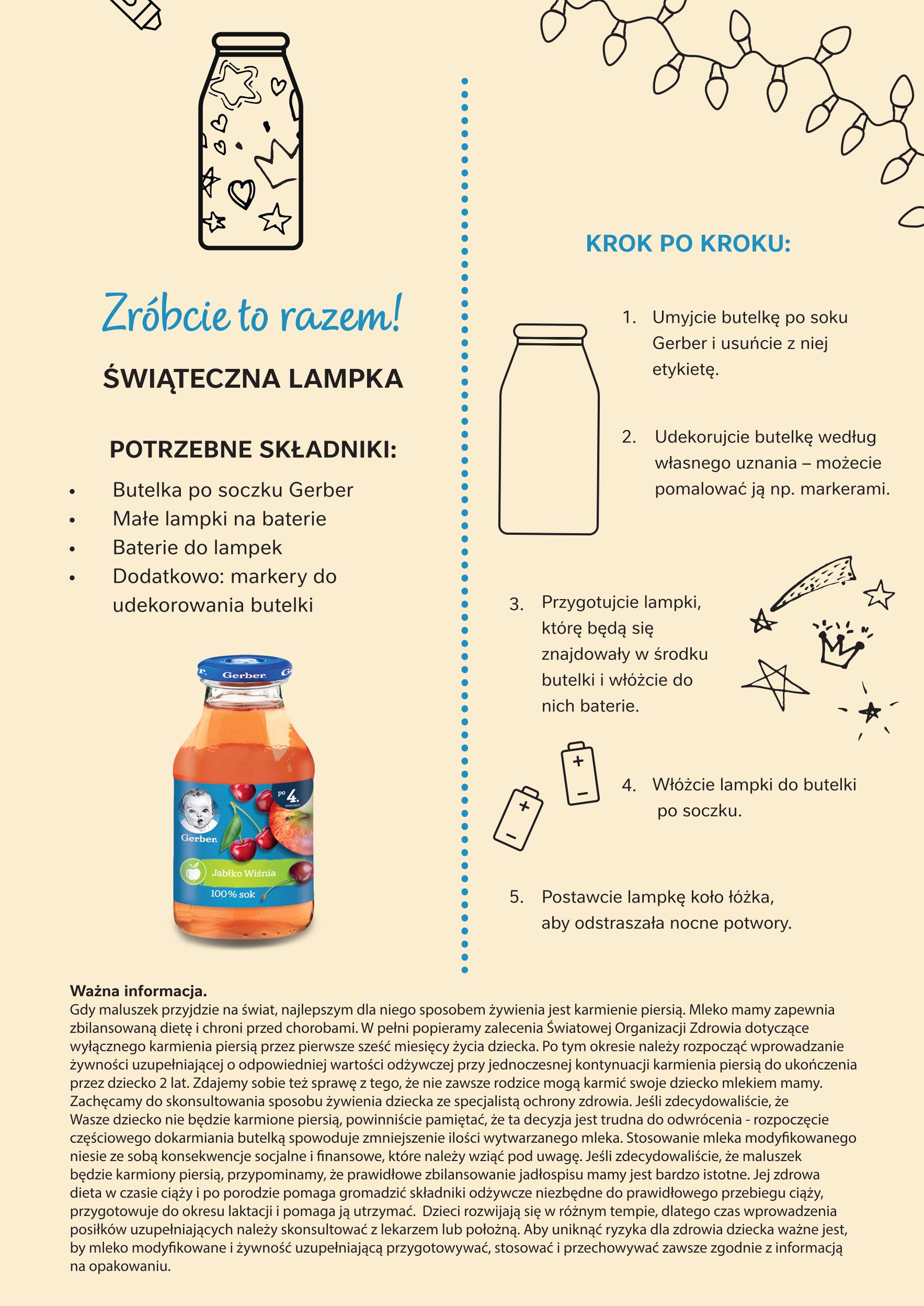 Oryginalną ozdobą może być też wykonana z butelki po soczku Gerber „lampka”, która pięknie rozświetli długie, zimowe wieczory. Wystarczy, że do pustej butelki włożycie światełka na baterie i odpowiednio udekorujecie szklaną powierzchnię – świąteczne oświetlenie, odstraszające nocne potwory, gotowe!