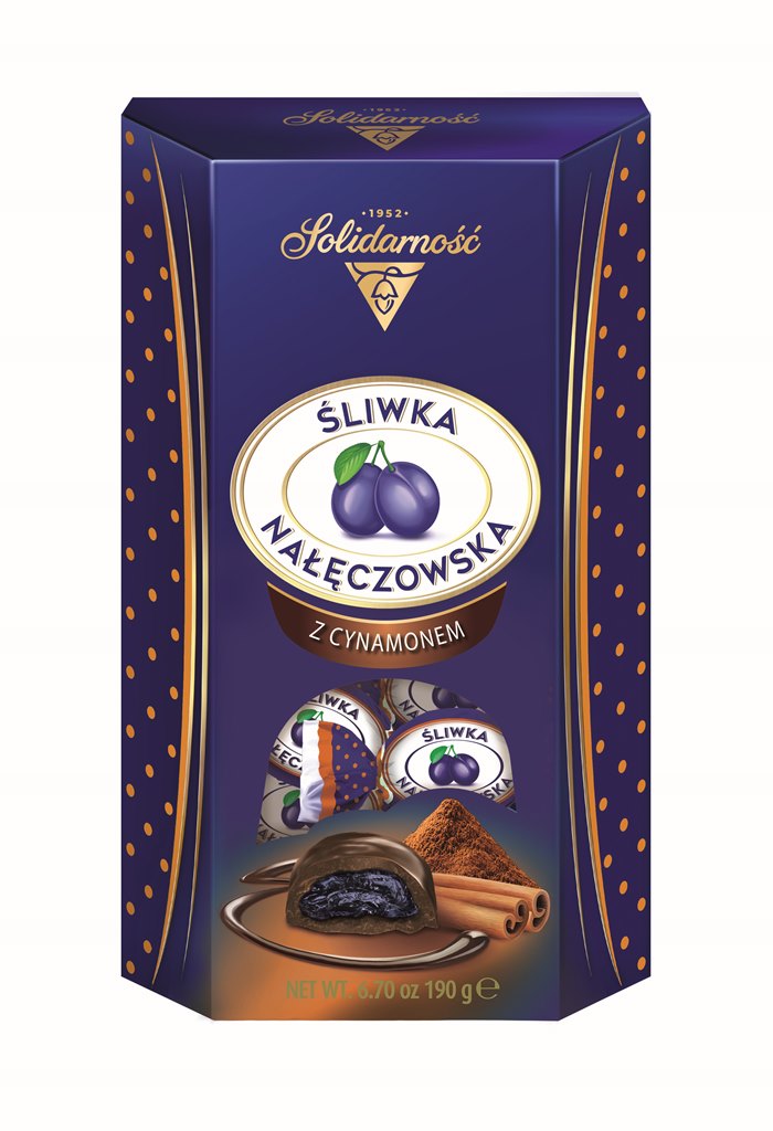 Śliwka Nałęczowska z cynamonem to nowość od marki Solidarność z edycji limitowanej na tegoroczne święta. Oryginalne polskie praliny od ponad 50 lat powstają podczas tradycyjnego procesu produkcji – ręcznie selekcjonowane polskie śliwki są otaczane delikatną masą kakaową i oblewane deserową czekoladą. W świątecznej odsłonie zyskały dodatkową nutkę aromatycznego cynamonu. Bardzo chętnie wybierane zarówno na elegancki, jak i niezobowiązujący prezent, idealne dla przyjaciół i rodziny z zagranicy! Prawdziwy smak pokoleń.