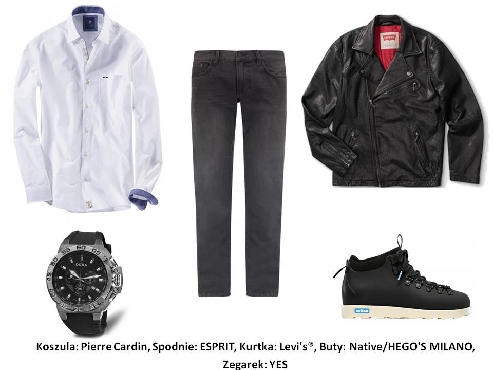 Dla mężczyzny, który ponad wszystko ceni sobie wygodę najlepszym rozwiązaniem będzie gładka biała koszula i skórzana kurtka. To ponadczasowe zestawienie sprawdza się przy każdej okazji. Najbardziej wyrazistym elementem stylizacji będą mocne buty o ciekawym, futurystycznym designie.